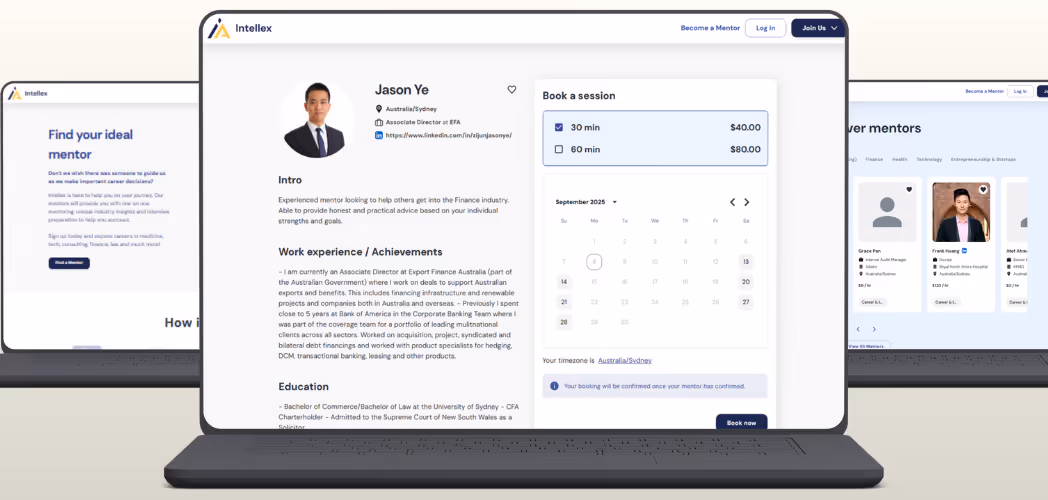 A complete web-based mentoring platform comprising mentor and mentee portals and an admin dashboard, fully tested and deployed. The Intellex platform is live and facilitating real-time mentorship sessions, supporting professionals through their career journeys with a reliable, scalable online solution.